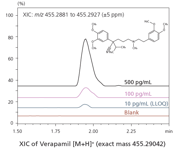The LCMS-9030 breaks new ground for quantitative analysis not only by its high sensitivity but also by the selectivity afforded by high MMA over a wide range of concentrations. Genuine ion statistics ensure that all measurements throughout the peak elution result within a narrow m/z window of the extracted ion chromatogram (XIC), as shown below for Verapamil analysis. Even at 10 fg injection, the overall mass error was less than 1 ppm and all data points gave results within the 5 ppm XIC window for accurate, repeatable and selective quantitation. Moreover, stability of MMA allows the same XIC setting to be comfortably used for series of analyses.