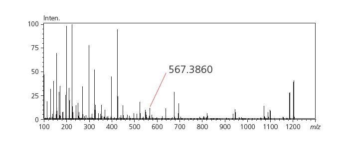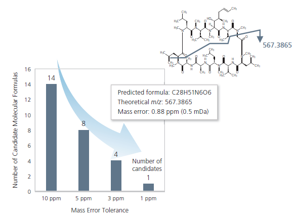 The results of MS/MS structural analysis of cyclosporine are shown below. Numerous ions were matched with putative fragment structures at less than 1 mDa mass error. Formula prediction results for m/z 567.3860 at different mass error tolerances demonstrate the impact of MS/MS MMA in making the prediction unambiguous.
