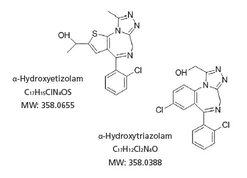 LCMS-9030 Mass Chromatogram of Etizolam, Triazolam, and Metabolites Spiked at 10 ng/mL in Whole Blood.
