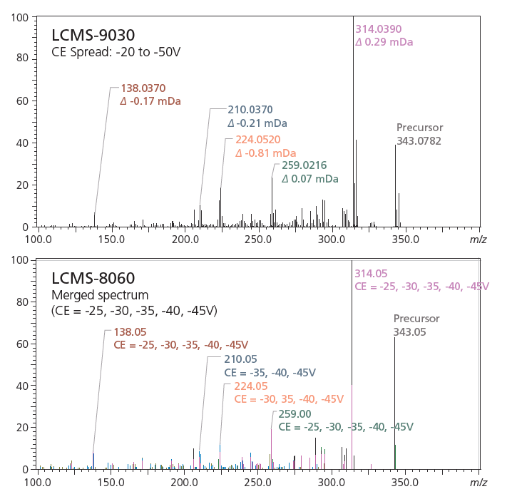 To make Data Dependent Acquisition (DDA) settings easy, the LCMS-9030 uses an automated range of collision energies for effective fragmentation. Shimadzu’s CE Spread function allows the user to obtain high-quality MS/MS spectra even when the optimal collision energy is not known. In the example below, the Q-TOF spectrum obtained with the CE Spread function is compared with the merged spectrum from a series of discrete collision energies obtained on the LCMS-8060. The excellent agreement of the results demonstrates the high-quality spectra that can be obtained from Q-TOF DDA experiments.
