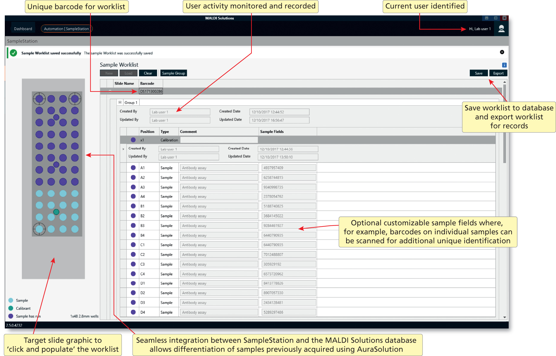 Central to each sample worklist is the unique sample slide identifier of the FlexiMass slide used to prepare the samples. The slide identifier (e.g. the FlexiMass-DS slide barcode) provides a link to the sample worklist associated with a given slide, ensuring traceability between sample and result throughout the workflow...