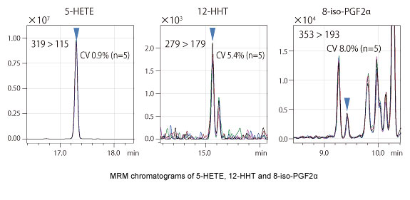 Comparison of No. of detected lipid mediators in human serumLipid mediators represent a class of bioactive lipids that are produced locally through specific biosynthetic pathways in response to extracellular stimuli. Lipid mediators are involved in many physiological processes, and their dysregulations have been often linked to various diseases such as inflammation, infertility, atherosclerosis, ischemia, metabolic syndrome, and cancer. To help further our understanding of lipid mediators in the disease process we have created a method package designed to detect lipid mediators derived from arachidonic acid cascade. Using the lipid mediator method package the LCMS-8060 detected arachidonic acids metabolites in human serum over a wide dynamic range from sub nM to μM concentrations. 5-HETE has shown the highest concentration which was 1 μM and the lowest was 12-HHT (0.5 nM). In case of 8-iso-PGF2α, its concentration was 0.1 nM.