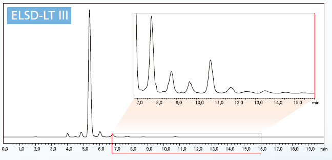 The evaporative light scattering detector (ELSD) is a general-purpose universal detector that can even detect components with no UV absorption, such as carbohydrates, lipids, surfactants, and synthetic polymers.*