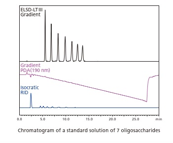 | Mobile phase | Water and acetonitrile ELSD-LT III and PDA… Gradient elution RID… Isocratic elution |