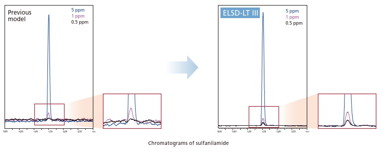 The ELSD-LT III includes a unique function that extends the dynamic range to enable detection over a signal intensity range of up to 5 orders of magnitude without switching gain levels. This enables the analysis of samples containing particularly high- or low-concentration compounds which would normally be difficult to quantify with one gain level, reducing both the total analysis time and the amount of solvent needed.