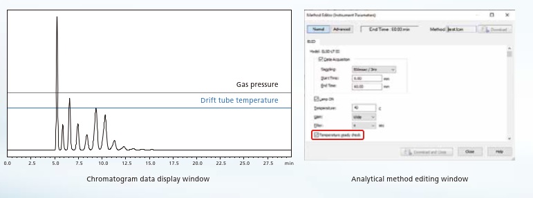 Featuring a unique nebulizer and drift tube design, the ELSD-LT III can efficiently evaporate samples even at low temperatures just by injecting a fine mist of mobile phase into the drift tube. As a result, it can detect both non-volatile and semi-volatile substances.