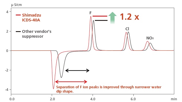 The ICDS-40A reduces peak spreading, increasing the sensitivity for components with low retention such as fluorine ions, and improves water dip separation, enabling highly-reliable results. Using an electrodialytic system which can carry out analysis and regenerations simultaneously, the analysis cycle time can be reduced and consecutive regeneration achieved, increasing the flexibility of the analysis time settings. In addition, the suppressor uses waste solution from the detector as regenerating solution, making environmentally-unfriendly regenerating solutions such as sulfuric acid unnecessary.