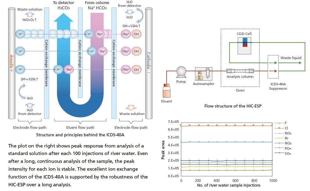 The ICDS-40A replaces sodium ions in the eluent with hydrogen ions with high efficiency using hydrogen ions obtained by electrolyzing water.