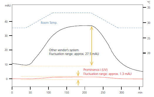 The UV/VIS detector and the PDA detector employ dual-temperature control (TC-Optics and flow cell) and provide measurements with a stable baseline hardly affected by room temperature fluctuation.