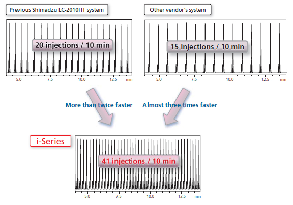 When analyzing a large number of analytes, it is crucial to reduce the time between analyses, specifically the time before the next sample injection. With an injection cycle of Ultra-Low Carryover Performance Enables High-Sensitivity Analysis Shimadzu Quality Means Reliability innovative about 14 seconds, the i-Series achieves processing speeds more than twice as fast as previous Shimadzu systems, and almost three times faster than other vendors' systems.