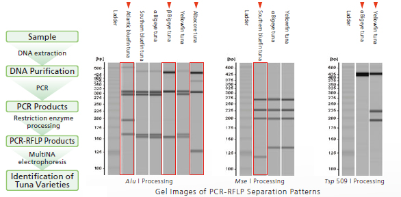 The tuna-specific genetic sequence in mitochondrial DNA is amplified using PCR. This amplified DNA is cleaved with a restriction enzyme and the pattern used to identify the tuna species. * PCR-RFLP: (Polymerase Chain Reaction-Restriction Fragment Polymorphism)