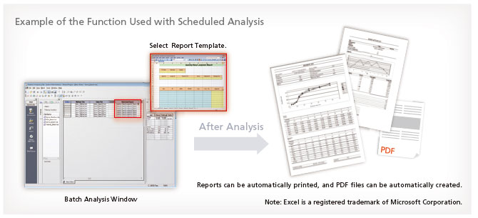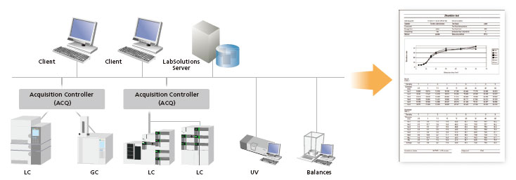 LabSolutions' Data Manager can prepare integrated reports using analysis data and results obtained from various instruments. Not only can reports be created for HPLC, GC, MS, FTIR, UV, balances, and other instruments individually, but they can include combined data from several instruments. Enables automatic printing of prepared reports and automatic generation of PDF files.