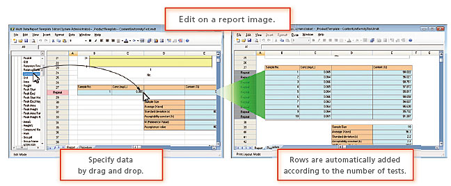 In addition to the normal analysis report creation function, LabSolutions offers the multi-data report creation function that allows the user to prepare reports with combined data from various instruments. It provides report templates for system conformance, content uniformity, elution, and other standard tests as standard. The operational environment is the same as for Excel, making it easy to prepare report formats for various standard tests. In addition, this function supports automatic report printing and automatic generation of PDF files.