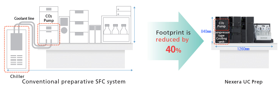 Usually a chiller is required to cool the solvent delivery pump when pumping CO2 at high flow rates. However, the Nexera UC Prep features a compressor-type cooling unit, reducing the size of the system and allowing it to be installed anywhere. Its footprint is equivalent to an analytical scale SFC system.