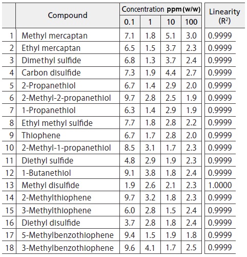 Repeatability (RSD%, n=5) and Linearity of Sulfur Compounds