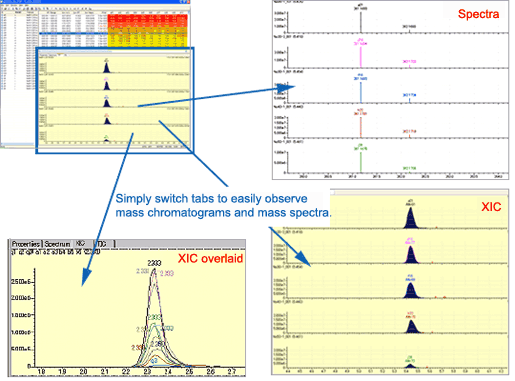 Chromatograms and mass spectra can be displayed for all data. Operations (division, integration, logic operations) and filtering functions for the signal intensities are provided to allow comparison and overview of the data.