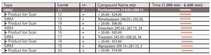 Quan/Qual method set up for the analysis of benzodiazepines in blood. The SSS method in rapid toxicology screening method package combines MRM and MRM triggered product ion scanning for 161 compounds.