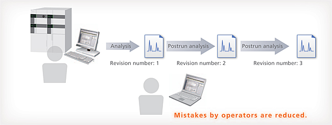 With LabSolutions DB and CS, the analysis data is managed securely by the database. Overwriting, deletion and other mistakes typical of data file management do not occur. In addition, when postrun analysis is performed using the acquired data, postrun analysis data revision numbers are automatically assigned, preventing the accidental overwriting of raw data. It is easy to display earlier data.