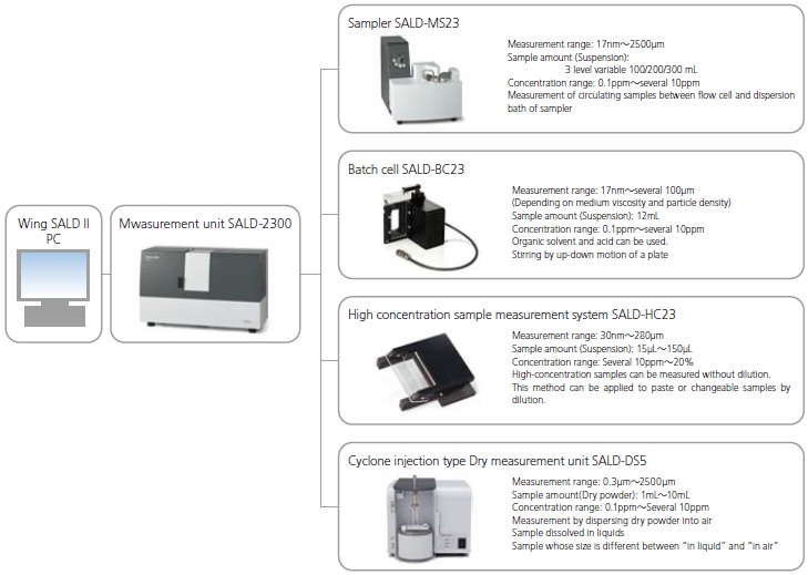 - Sample amount for SALD-MS23 is variable: 100mL, 200mL, or 300mL.