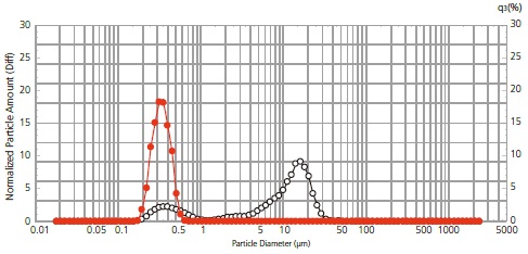 The agglomeration particle (micrometer range) has been dispersed to the fine particle (sub-micrometer range) by dispersion processing using a homogenizer. The sample (sample that absorbs light like the carbon black) that doesn't transmit light easily can be measured based on the improvement in sensitivity.