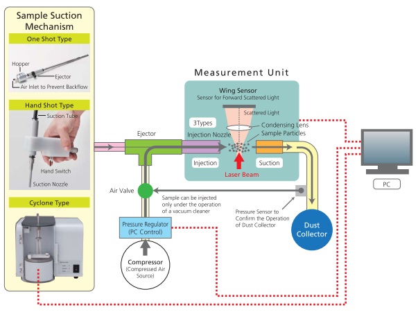 | Safety interlocks | If the injection continues while the dust collector is not running, large amounts of sample will be dispersed inside the measuring unit and fatally damage the lens and sensor. To avoid this problem, a pressure sensor is installed on the piping connected to the dust connector. This sensor closes the air valve between the compressor and ejector while the dust collector is not running to stop sample suction and injection. In other words, the sample is injected into the measuring unit only while the dust collector is running. |