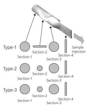 - An injection nozzle to obtain optimum dispersion can be selected from the 3 types of injection nozzles, depending on the sample property.