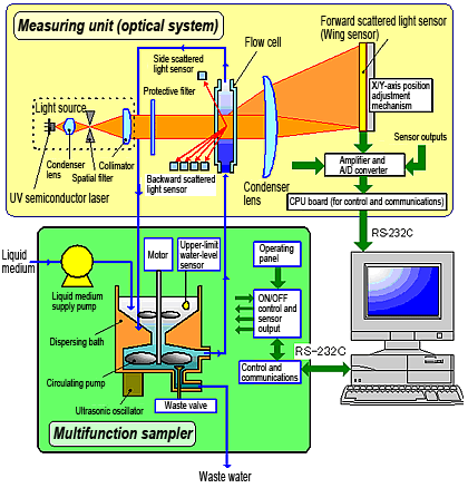 The most basic or most typical means of measurement used in laser diffraction particle size analyzers is circulation measurement. Circulation measurement is achieved on the SALD-2300 and SALD-7500 by the SALD-MS series multifunction sampler. As shown in the configuration and structure figures below, particle size distribution is measured while the particle group dispersed in liquid medium is circulated between the dispersing bath in the multifunction sampler and the flow cell located inside the measuring unit (optical system). Even when measuring samples having a wide distribution width on a multifunction sampler, it is less likely to be affected by sampling error since a relatively large amount of sample is measured. Another feature of a multifunction sampler is that it is less likely to be affected by sedimentation of particles even when measuring samples having a relatively large particle size or large density since the sample is circulated during measurement. Even when a sampling unit such as a batch cell that can accommodate smaller sample amounts is adopted, ultimately the measurement results obtained by using a multifunction sampler are the basis for selection of a sampling unit.