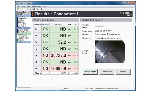 TThe optional screening analysis kits allow even beginners to start RoHS, ELV, halogen, or antimony screening analysis right from the day of purchase. Simply mount the sample, select the analysis conditions, enter the sample name, and wait for the results. The analysis results are displayed with a pass/fail evaluation after just a few minutes.