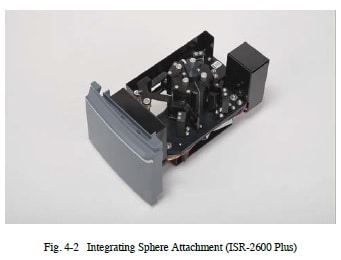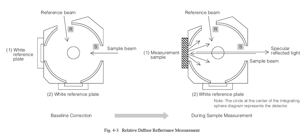 Fig. 4-2 shows an integrating sphere attachment used to measure relative diffuse reflectance. When using an integrating sphere, a material such as barium sulfate or specialized fluorine-based polymer (see Note 1) is used as the reference plate (sometimes referred to as a white reference plate).