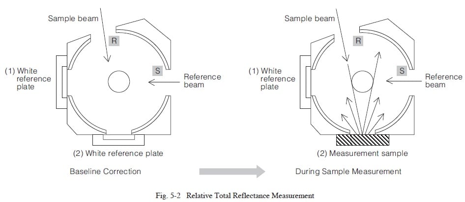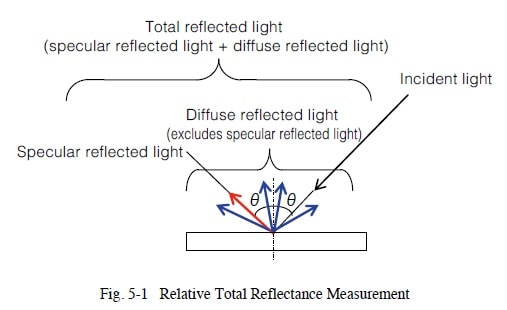 Relative total reflectance is measured using an integrating sphere attachment. Relative total reflectance is measured by shining light on the sample at an incident angle of about 10 degrees or less (8 degrees for Shimadzu integrating spheres) and using an integrating sphere to measure not only the diffuse reflected light, but also the specular reflected light.