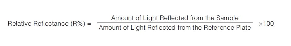 Reflectance measurements measure either the relative or absolute reflected light, with measurement values expressed in terms of reflectance. Relative reflectance measurements calculate the proportional amount of reflected light measured from a sample surface, relative to the amount of reflected light measured from a reference plate, such as barium sulfate or a mirror. The relative reflectance is calculated based on assuming the reference plate has a reflectance of 100 %. Therefore, it is very important to manage reference plates properly because different reflectance values can be obtained if reference plates are substituted or if they become contaminated or change characteristics.