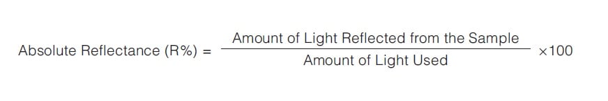 In contrast, absolute reflectance measurements calculate the proportional amount of reflected light relative to the amount of light measured directly from a light source, not using a reference plate such as barium sulfate or a mirror. Reflectance measurement values are based on assuming a 100 % reflectance for air. Absolute reflectance measurements allow determining the true reflectance of samples, which is referred to as absolute reflectance.