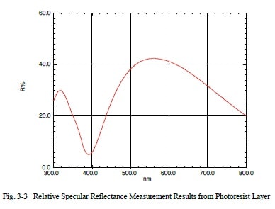 Fig. 3-3 shows results from measuring a photoresist layer on a wafer using a specular reflectance measurement attachment. This provides the relative reflectance of the sample relative to the aluminum-coated mirror that was used as the reference. However, this specular reflectance measurement attachment cannot be used to measure the diffuse light reflected from samples with a rough surface.