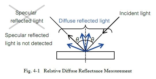 Relative diffuse reflectance is measured by using an integrating sphere to measure the diffuse reflected light with specular reflected light excluded, as shown in Fig. 4-1. This is used to measure samples with a rough surface, such as paper.