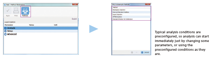AOC-6000 method files (for liquid, HS, and SPME injections) are preconfigured with typical analysis conditions. Injection volume and other parameters that need to be changed for each analysis can be easily edited.