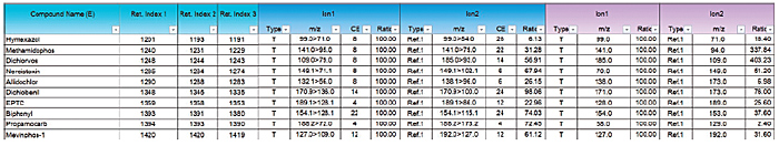 Smart Pesticides Database contains the retention indices and transitions for 530 pesticides. Ver. 2 additionally contains measurement ions for SIM mode, so it can be applied to both SIM and MRM analyses. Thanks to the retention indices contained in the database and the AART function, retention times can be revised automatically without the use of pesticide standards. Furthermore, the Smart MRM/SIM function allows automatic creation of the optimal measurement programs for multicomponent simultaneous analysis using MRM and SIM modes. Lastly, the database can be customized to the GC conditions and the addition of new components.
