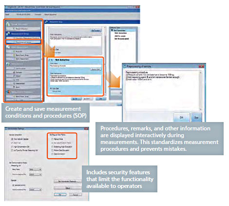 Creating, saving, and sharing measurement conditions and procedures, including pretreatment methods and conditions, ensures measurements are performed using the same conditions and procedures, even if performed by a different operator or at a different location or plant, and allows safely comparing data.