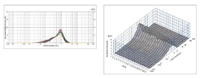 Changes in particle size distributions and particle diameters are measured continuously, at intervals as short as one second, and the results are saved. Furthermore, the results can be subjected to multifaceted analysis and evaluation using functions such as 3D graphing. For example, the reaction processes that occur when particle groups disperse, aggregate, or dissolve can be monitored