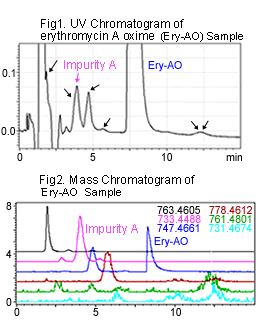 Fig.1 and Fig. 2 show the UV and MS chromatograms of Erythromycin A oxime (Ery-AO) which is a macrolide antibiotic produced by a strain of bacteria known as Saccaropolyspora erythraea. Some impurities are indicated.