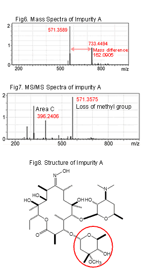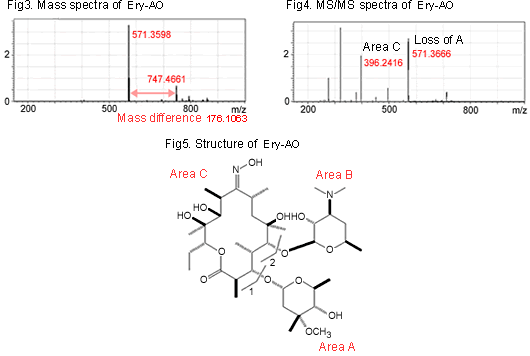 The mass difference of m/z=396.2406 is 0.002 compared with the theoretical figure of Area C(396.2386). m/z=571 is also detected and it is similar to the MS/MS spectra of Ery-AO. However, the molecular weight of an impurity A is 733, and the mass difference between the impurity A and the loss from that is 162. While the mass difference from Area A of Ery-AO is 14.0144. Using the Accurate Mass Calculator, this figure is considered as CH2 (14.0156), and it is assumed that the impurity A has a structure which is substituted from one methyl group of Area A to one hydrogen.