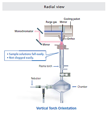 The torch is oriented vertically to minimize any adhesion of sample on the torch walls, thus reducing memory effects.