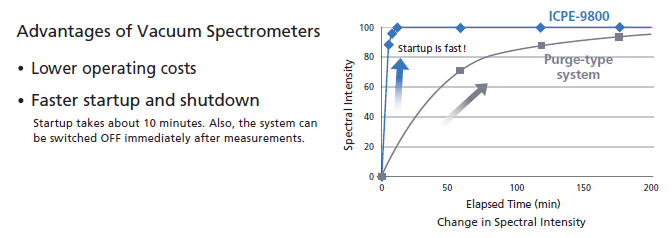 To enable measurements of wavelengths in the vacuum UV region (below 190 nm) ICPE-9800 systems employ a vacuum pump (rotary pump) to evacuate the air and remove oxygen from inside the spectrometer. This ensures a shorter startup time in comparison to purge-type systems. When the pump stops, a solenoid valve automatically closes to maintain the vacuum inside the spectrometer. Consequently, there is no need to worry about contamination from atmospheric air flowing back into the spectrometer after the pump stops.