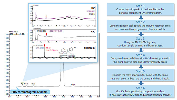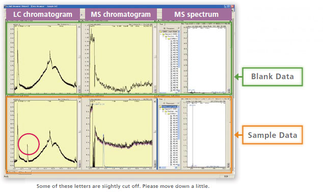 Using the data browser function provided with LCMSsolution makes it easy to compare the details and differences between sample data and blank data, enhancing the efficiency of the impurity identification process. Remarks and Precautions