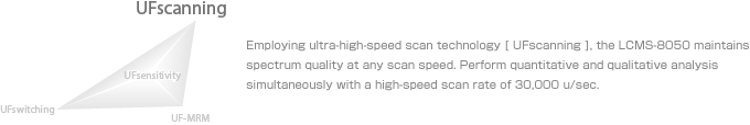 The LCMS-8050 is capable of simultaneously obtaining both qualitative and quantitative information in a single analysis. Acquisition occurs so rapidly that MS/MS scans and MRM measurements can be performed concurrently while maintaining quantitative accuracy. MS/MS scans are usable and reliable because even at 30,000 u/sec, Shimadzu uses a 0.1 u scan step.