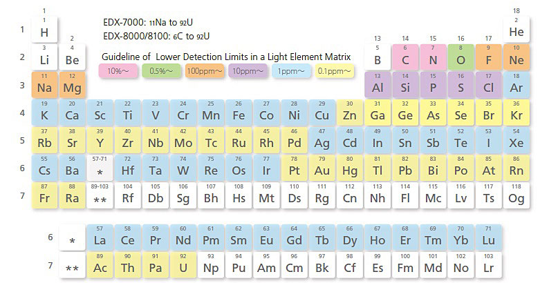 The EDX-8000/8100 features an SDD detector with a special ultra-thin-film window material that is able to detect ultra-light elements such as carbon (C), oxygen (O), and fluorine (F)