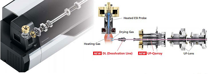 With the newly designed UF-Qarray, improved ion focusing efficiency results in greater signal intensity and a reduction in noise. By improving the ion sampling device (desolvation line) and the ion guide (UF-Qarray), and enhancing the vacuum efficiency, the LCMS-8060 defines sensitivity. These new technologies allow for improvements in sensitivity and robustness in all acquisition modes.