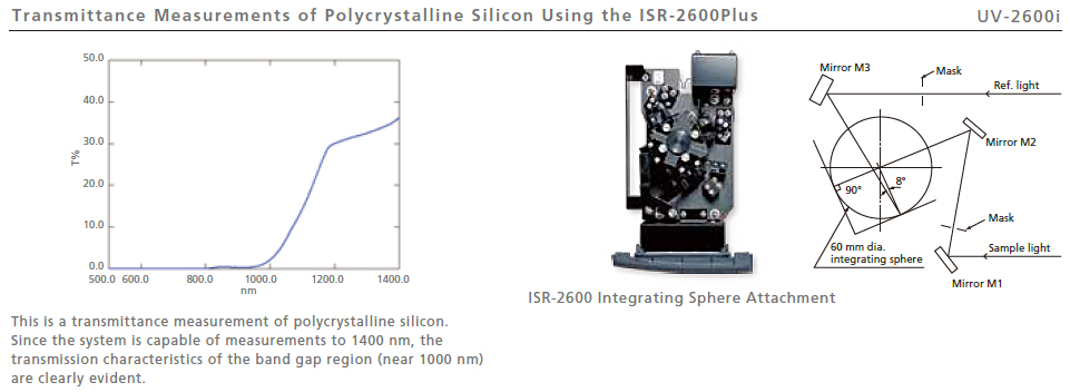 The UV-2600i is also equipped with Shimadzu's proprietary Lo-Ray-Ligh grade diffraction grating, which achieves high efficiency and low stray light levels. By installing the ISR-2600Plus two-detector integrating sphere, the 300 nm to 1100 nm wavelength range of conventional models can be extended to 1400 nm. In addition, the UV-2600i achieves a significant noise reduction, and can accommodate measurements of solar cell anti-reflective films and polycrystalline silicon wafers.